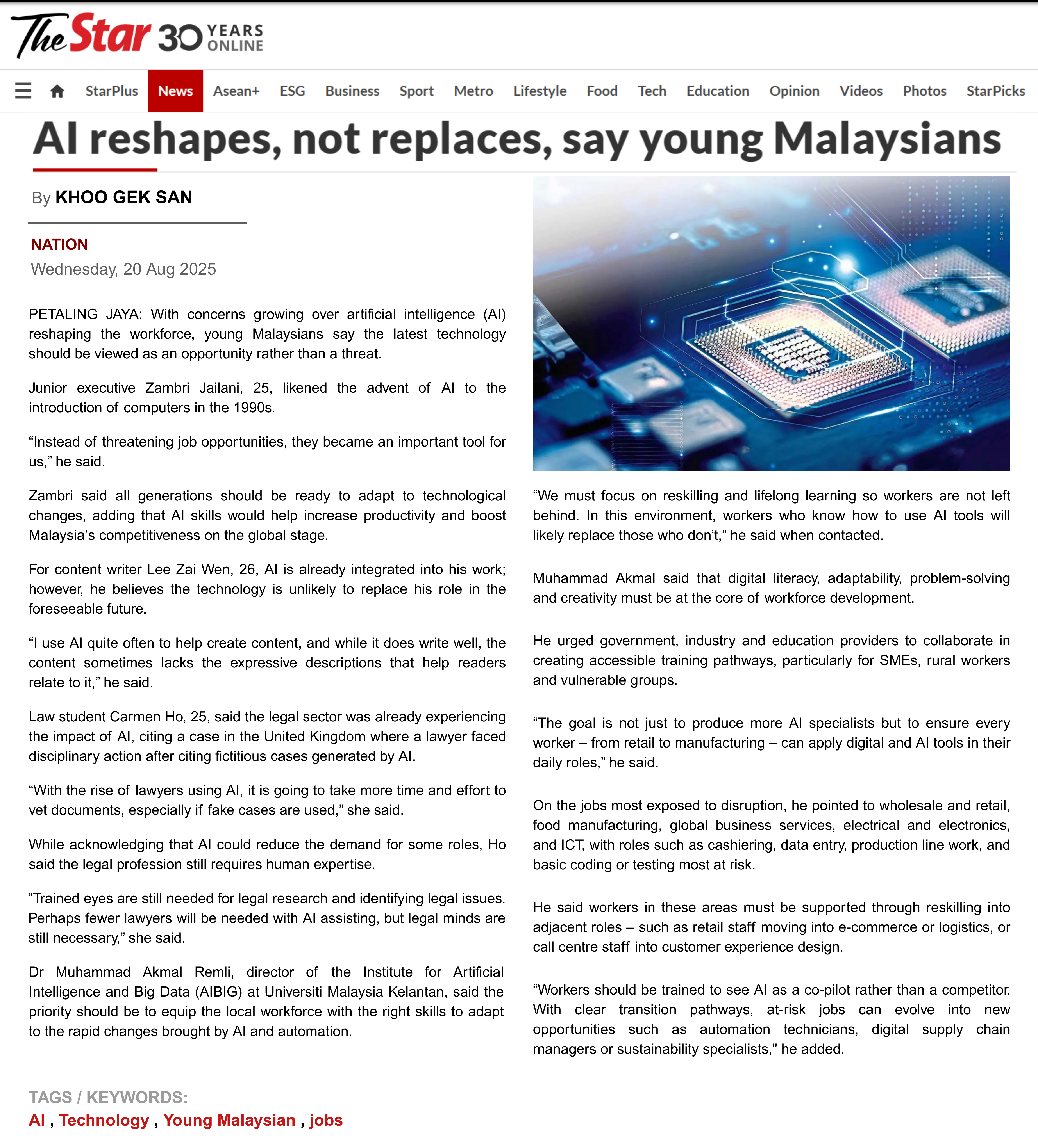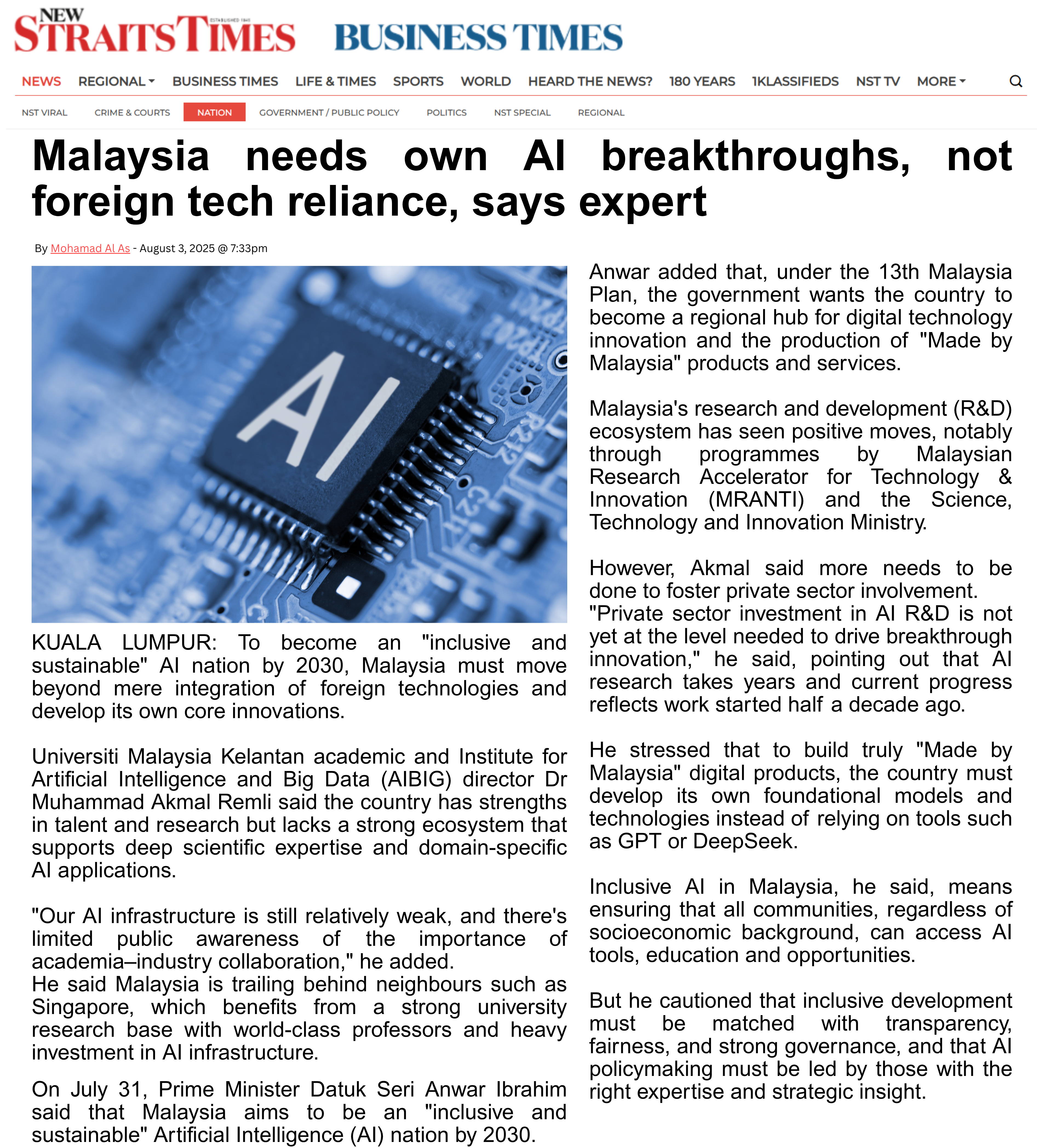 I have contributed to and been featured in various Malaysian newspapers and TV channels to discuss topics related to artificial intelligence. Among these outlets are Utusan Malaysia, New Straits Times, Astro Awani, Bernama TV, The Sun, and Berita Harian.